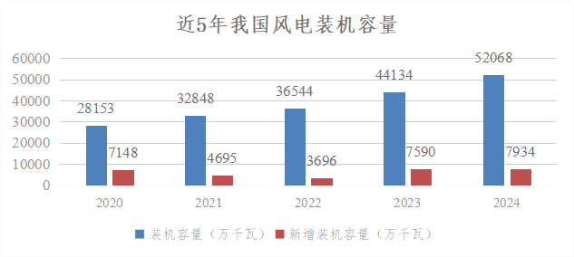 截至2024年末,全國風電累計并網容量達到5.21億千瓦,同比增長18%,其中陸上風電4.8億千瓦,海上風電4127萬千瓦,在全國電力裝機中排在第3位。全年新增裝機容量7982萬千瓦,同比增長6%,其中陸上風電7579萬千瓦,海上風電404萬千瓦。從新增裝機分布看,“三北”地區占全國新增裝機的75%。2024年,全國風電發電量9916億千瓦時,同比增長16%,僅次于火電和水電,排在第3位;全年并網發電利用小時數為2127小時,平均上網利用率95.9%。