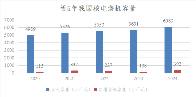2024年是我國核電發展具有里程碑的一年,全年新核準11臺核電機組,為歷年核準數量之最,連續3年核準機組數量超過10臺;投入運行核電機組2臺,新增額定裝機規模240萬千瓦;在運、在建和核準待建核電機組共有102臺,總裝機容量1.13億千瓦,連續2年位居全球首位。截至當年末,全國運行核電機組共有57臺(不含臺灣地區),額定裝機容量為5943.17萬千瓦。全年累計核電發電量為4451.75億千瓦時,比上年同期上升了2.72%,占全國累計發電量的4.73%,超過太陽能發電量,排在第4位。由此可見,我國核電裝機占全國總裝機的比例不到2%,但發出的電量接近全國總發電量的5%。年設備利用小時數為7805.74小時,平均機組能力因子為90.26%。