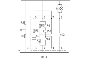 R1 ,R2( R1=R2 )絕為橋臂平衡電阻, R5 ,R6系直流母線對地絕緣電阻,靈敏元件K1跨接在地和平衡電阻之間。正常時,電橋平衡,靈敏元件繞組無電流通過。在一側絕線電阻下降時,便有一不平衡電流通過靈敏元件繞組,當不平衡電流達到一定值時動作,再由K1觸點接通K2繞組,隨即繼電器發出報警信號。