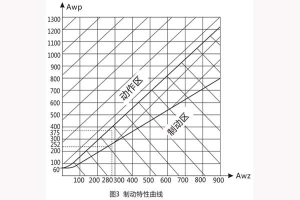 4.由動作電流與制動電流的比值所決定的制動系數Kz可以在廣泛的范圍內變化,圖3的制動特性AWp=f(AWz)是其極限范圍,它與工作電流濟口制動電流間的相位角有關,但無論在任何角下都不應越出曲線的范圍。